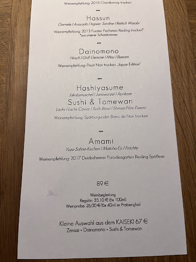 Read moreSpacious, well designed restaurant with excellent food and service to match. We particularly enjoyed being able to hold a conversation without the noise level intruding. We had the Kaiseki menü for 89€ p. p. And the Weinprobe for 26€. We felt the price was well justified and the food was exquisite in presentation, marvelously varied in flavour and the quantity was just right. This is a place for gourmets rather than gourmands. It feels genuine in its Japanese character whilst embracing the local architecture and wines in...