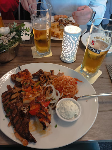 Die Speisekarte ist sehr umfangreich, von Vorspeisen - Teigtaschen mit Hirtenkäse sind sehr zu empfehlen, es werden zwei pro Person serviert - Suppen und Bruschetta über die Hauptspeisen, ob klassische griechische Gerichte, Lammteller, Gyros oder bestimmte spezielle Teller, alles klingt sehr lecker. Wir hatten einen Teller für 2, Lammkoteletts und Lammfilet mit Hähnchenbrust. Da kam ein Krautsalat als Vorspeise vorweg und als Hauptspeise der Teller mit dem Fleisch und gewürztem Reis, welcher warm gehalten wurde. Alles sehr lecker und warm, das Lamm war sehr zart und lecker. Das Hähnchen war gut durch und rauchig. Alles in allem wirklich sehr lecker. Wir haben noch zum Nachtisch bestellt, ein Spaghetti-Eis und eine Strawberry-Cheesecake bestellt. Letztere kam in einem Glas. Das Spaghetti-Eis sah nicht so lecker aus und schmeckte auch nicht so gut. Die Erdbeer-Sauce war sehr dunkel, das Eis sah eher etwas eingefallen aus. Die Cheesecake war sehr lecker bis auf den Biskuit in der Mitte, welcher geschmacklich nicht ganz so lecker war. Das ist aber alles meckern auf hohem Niveau, es war wirklich sehr lecker und der Service war top. Immer freundlich, selbst bei sehr vollem Haus und viel Kundschaft. Das Ambiente war sehr modern, offen und trotzdem nischenmäßig gestaltet, ein Ort zum Wohlfühlen, gutem Essen und Entspannen oder viel Quatschen. Es hat sich definitiv gelohnt. Natürlich gab es auch den Ouzo vorweg - nach dem Essen wahlweise Ouzo oder Marsala. Wir wählten den Marsala. Es war wirklich alles in allem sehr lecker und das Ambiente war sehr modern und griechisch gestaltet. Wir saßen direkt vor einem Kamin, der nicht an war. Trotz der teilweise engen Gänge kam man gut durch und an seinen Platz. Teilweise etwas laut, wer geräuschempfindlich ist - oder viele Gespräche nicht so gut ausblenden kann - sollte darüber nachdenken ob der Grieche der richtige Ort für einen ist.