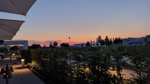 Sitzmöglichkeiten außen: Draußen gibt es eine extrem große Terrasse mit viel Platz. Zwar in einem Industriegebiet, durch die Bauabstände bekommt man davon aber wenig mit. Stattdessen wurden wir mit einem herrlichen Sonnenuntergang mit Blick auf die schwäbische Alb belohnt (siehe Bilder)