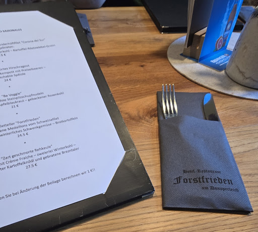 Read moreUpdate vom 22.05.2022 Wir mal wieder zum Mittagessen im Forstfrieden. Zum zweiten Mal an einem Sonntag, dazu muss gesagt werden, daß es am Sonntag eine stark eingeschränkte Speisekarte gibt. Desweiteren sind am Sonntag überwiegend Gesellschaften dort. Der Service für die Laufkundschaft ist sehr vernachlässigt. Wir haben ca. eine halbe Stunde auf die Vorspeise (Suppe) gewartet. Nach weiteren 45 Minuten erhielten wir die Hauptspeisen. Auf Nachfrage beim Service hieß es zunächst, daß es daran lag, daß wir eine Vorspeise hatten. Die zweite Nachfrage ergab dann den waren Grund, wir haben eine Gesellschaft zu versorgen. Also, wenn ihr dorthin wollt, dann nicht Sonntags am Mittag.
