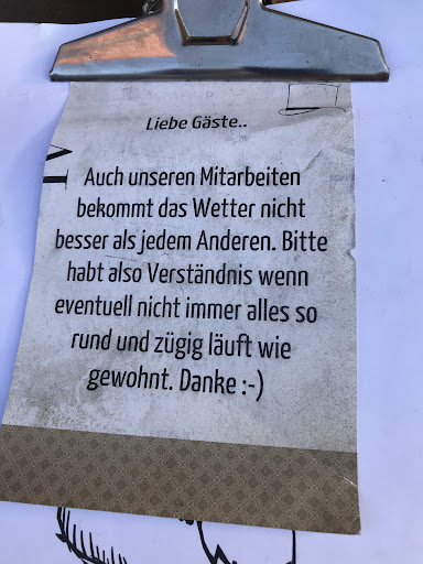 Der Service war sehr schwach. Wir waren 2h da und bekamen in der Zeit zwei GetrĂ€nke und das Essen. Mehr war nicht drin, denn hĂ€ufiger war keine Gelegenheit etwas zu bestellen. Auf den Burger warteten wir untrem Strich gut eine Stunde. Auf das erste GetrĂ€nk bei etwa 35 Grad AuĂentemperatur gut 30 Minuten. Sorry, das geht gar nicht!