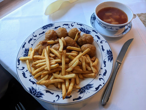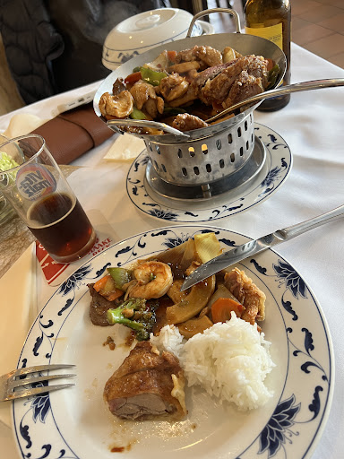 Essen war sehr lecker, Gemüse in Ordnung, Fleisch Mix inkl. Einer Garnele im FeuerTopf serviert war auch lecker, sehr heiß und zart. Auf der Karte: S6. Es hätte auch ne Garnele mehr sein können, schließlich ist es die günstige gefrorene ohne Schale... Die Thai Curry Sauce wurde wie es sich gehört mit Kokos Milch frisch zubereitet, so muss es sein. Meine dunkle Sauce war vermutlich auch mit einer fertigen gestreckt, was aber aufgrund des guten Geschmackes völlig in Ordnung war.