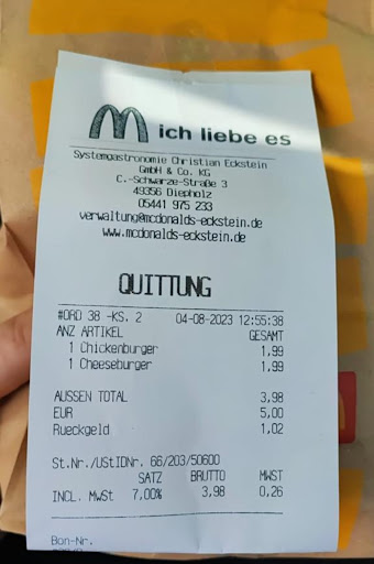 Read moreAlso, nachdem ich den Spruch des Mitarbeiters "Sie müssen mir nicht meinen Job erklären", zum Abschied nun etwas sacken lassen habe, muss ich sagen... DOCH. MUSS ICH! Denn ganz offensichtlich sind simpelste Aufgaben wie z. B. drei Menüs auch 3 Getränke zuzuordnen (und nicht nur zwei) schon zuviel für den "netten" Mitarbeiter. Erst die Getränke GAR nicht gehabt, dann die falschen, dann nicht die korrekte Anzahl... Kein Wunder dass nach solch einer langen Diskussion die Pommes wohl frisch aus dem Kühlschrank kamen, so kalt wie sie waren. Falsche Burger waren übrigens auch noch verpackt. Wäre die Aufnahme der Bestellung nun wenigstens zufriedenstellend gewesen, hätte ich nen zweiten Stern vergeben. Aber das war rundum ne glatte 6 mit Sternchen. Aus zeitlichen Gründen war ich am Sonntag bei Mc Donalds in Diepholz und auch da war der ganze Spaß eine Vollkatastrophe. Schade dass man einen Stern vergeben muss weil dieser Betrieb definitiv keinen verdient hat. Mich sehen die da so schnell nicht wieder. Da bestell ich mir lieber nen Döner oder muss mich dem Wettbewerb mit der...