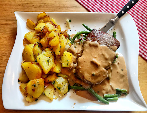 Das Essen, bestehend aus zwei Gerichten mit Hühnchen mit Gemüse und Kohlroulade mit Kartoffeln, ist handwerklich nicht schlecht, mit Tiefkühlgemüse, jedoch selbst gemachter Champignon-Sauce wohl teilweise nicht frisch und geschmacklich nicht schlecht. Anzumerken dabei ist, dass das Hähnchen mit Gemüse ohne die gesondert bestellte Champignon-Sauce extrem trocken gewesen wäre. Zu solch einem Gericht gehört daher auch naturgemäß eine gewisse Soße. Bei der Konzeption der Gerichte besteht eindeutig Besserungsbedarf. Die Größe der Gerichte waren dem Preis entsprechend.