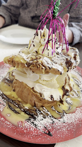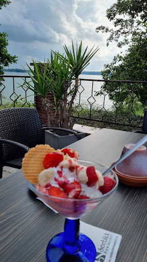 Read moreEine wirklich schöne LokalitĂ€t, sauber und gepflegt. Tolle Lage. Die Karte ist vielseitig. Wir waren heute (Donnerstag) Nachmittag da. 4 Erwachsene und 2 kleine Kinder. Wir waren die meiste Zeit die einzigen GĂ€ste. Unsere Begleitung hatte von den Windbeuteln geschwĂ€rmt. Das Eis war sehr lecker, auch wenn sich schon Kristalle darauf gebildet hatten, was eine fehlerhafte Lagerung und Pflege aufzeigt. Der Windbeutel war leider zu trocken. Also extrem trocken, vergleichbar mit einem alten harten Croissant. Der Rest war aber gut. Leider war der Service mit uns und unserer Bestellung ĂŒberfordert. 1. Sie konnte uns nicht den Kuchen in der Auslage benennen. Musste es erfragen. 2. Sie brauchte sehr lange fĂŒr unsere Bestellung, mit der Entschuldigung, sie sei allein und wenn dann noch GĂ€ste etwas von ihr wollten....WIr waren die einzigen GĂ€ste zu dem Zeitpunkt! 3. Zucker zum Kaffee Latte gab es auch nur auf Nachfrage und durch Hilfe einer KĂŒchenkraft. 4. Auf unsere Frage, ob der Windbeutel so sein mĂŒsse (von unserer Begleitung wussten wir, dass dem nicht so ist) kam nur ein: "Ich weiĂ auch nicht. Vielleicht war es nach dem Auftauen zu lange gebacken worden", keine Entschuldigung, kein Entgegenkommen. 5. Zum Latte wurden kleine Löffel gereicht, die fĂŒr das Glas viel zu klein sind. Ansonsten war es aber nett. Wirklich schade. Aber war anscheinend ein schlechter Tag. Wir werden es aber gern noch...