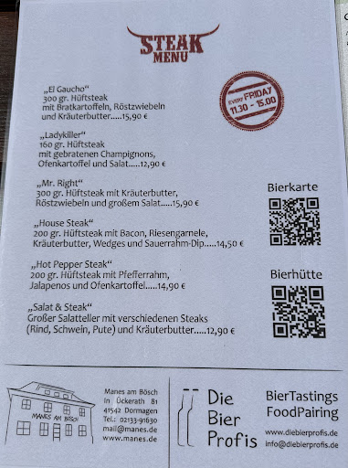 Leute, es tut mir leid, aber Manes am Bösch ist für uns erledigt! Wir waren heute Abend da um das schöne Wetter nochmal auszunutzen und hatten uns auf das leckere Hüftsteak gefreut. Zunächst mal kam eine tranfunzelige Bedienung, die wir dort noch nicht gesehen hatten und nahm schon mal die Getränkebestellung auf. Damit jedoch war der Service beendet. Gäste die nach uns kamen wurden bedient und deren Essensbestellung aufgenommen, während wir weder das übliche Amuse Geuille bekamen und leider auch nicht los werden konnten, was wir gerne essen würden. Nachdem dies dann schließlich doch noch geklappt hat, kam immer noch kein Brot mit lecker Tunke. Auch zu der georderten Vorspeise wurde kein Brot gereicht. Auf Nachfrage bei der Bedienung erhielten wir die Antwort, "dass das Brot aus sei!". Dann kamen unsere Hauptgerichte: 2x Mr. Right! 300gr Hüftsteak auf Salat. Mr Right stellte sich schnell als Mr. Wrong heraus. Das Fleisch war zäh und sehnig und wir haben die Hälfte davon mit entsprechendem Kommentar zurückgehen lassen. Auch der Salat war nicht wirklich der "Burner", eine halbe Tomate in vier Achtel geteilt, drei, vier Scheibchen Gurke, zwei, drei Schnitze Paprika, ein wenig Mais und der Rest war günstiger Eisbergsalat. Zwischenzeitlich erhielten andere Gäste das von uns vermisste Brot mit Dipp. Als wir die Bedienung darauf ansprachen, meinte sie, dass mittlerweile frisches Brot aufgebacken worden sei. Punkt! Keine Frage, ob wir eventuell noch etwas davon haben wollten. Insgeheim hatten wir darauf gehofft, da wir den bei der Vorspeise enthaltenen Quark aufgespart hatten. Verärgert über diese Service orderten wir die Rechnung. Tatsächlich wurde uns eine Rechnung von 50,90€ gereicht, mit keinem Wort der Entschuldigung für das absolut untragbare Fleisch oder vielleicht dem Versuch einer Wiedergutmachung. Das war`s dann wohl mit uns und dem Manes. Schade, denn wir waren jahrelang...