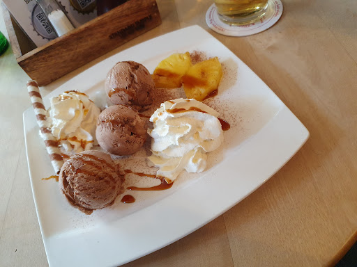 Read moreKostenlose Parkplätze, schöne Lokalität mit rustikalem Ambiente. Das Lokal war an einem Donnerstag um 18:00 schon ausgebucht. Personal freundlich, aufmerksam und bemüht. Vorweg gab es Brot mit Dip, das Brot schmeckte alt und war kalt. Der Dip sehr lecker aber leider auch in einem Styroporbehälter. Essen große Portionen zu sehr günstigen Preisen. Ich hatte El Gaucho 300g arg. Hüftsteak mit Schmorzwiebeln und Bratkartoffeln und Kräuterbutter. Alles sehr lecker und reichlich. Ich persönlich hätte es besser gefunden wenn die Kräuterbutter nicht in einem Styroporbehälter gekommen wäre. Die Bratkartoffeln mag ich lieber wenn sie aus festkochend Kartoffeln gemacht sind und dünner geschnitten, und damit knusprig. Das ist aber Geschmackssache. Meine Frau hatte Salat und Beef insgesamt war sie sehr zufrieden, die Angus Filetstreifen waren wohl einwenig zäh. Unsere Freunde hatten die Currywurst und den Salat mit Hähnchenbrust. Beide waren zufrieden. Getrunken haben wir ein Weißbier, 3x Apfelscholle, Radler, 2x Pils und ein Wasser. Als Nachtisch hatte ich das Nutella-Krokant Parfee sehr lecker und sättigend. Die Ananasstücke waren sehr leckere. Die Sahne war ok viel schnell zusammen, ich vermute keine frische. Und es war auch eher ein Eis als ein Prafee. Mit Trinkgeld lagen wir gerade mal bei 110€. Top sehr zu empfehlen. Wir...