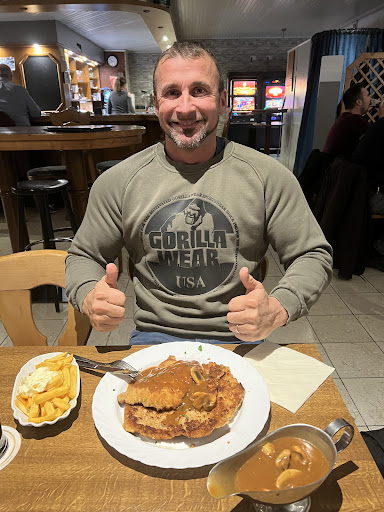 Read moreIch war heute, 27.07.25, zum ersten Mal dort mir einem Kollegen essen. Die Lokation sieht von außen ansprechend aus, innen typische Gaststätte mit Thekenbetrieb, Angrenzend eine überdachte Terrasse ( bei den Temperaturen ungeeignet zum Essen ) und dahinter ein Biergarten. Es macht Alles einen guten Eindruck. Sehr freundliche und aufmerksame Bedienung. Viele tolle Schnitzelgerichte auf der Karte in Normalversion ( 180 gr. ) oder als Rentnerversion ( 90 gr. ) oder als Xl/XXL ( 360/500 gr. ). Wir haben uns für die normale Portion entschieden, die auch absolut ausreichend war. Vorab gab es einen Salat mit einem weißen Dressing ( analog zu Joghurt oder Sylter Art ), der war OK, mehr aber auch nicht. Es war wohl mehr aus Dose und Glas darin als frischer Salat. Das Schnitzel, besser gesagt die 2 Schnitzel, die auf dem Teller waren, haben es wieder wett gemacht. Aus dem Schweinerücken geschnitten, mager und lecker paniert, dazu die Sauce in einem separaten Schälchen auf dem Teller, so dass man sich entscheiden konnte, ob man nun viel oder wenig Sauce auf das Fleisch haben wollte. Die Rahmsauce war mit frischen Champignons, leckere Fritten dazu eine schmackhafte Mayonnaise gegen Aufpreis. Alles in Allem zu empfehlen, die Preise passen ( auch für Getränke ) und der Weg dahin lohnt sich, wenn man gerne ein leckeres Schnitzel isst. Danke an das Team, Daumen hoch...