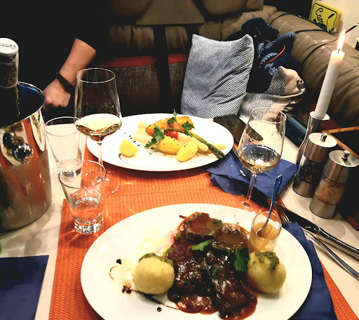 Read moreWe've had a lovely womo dinner evening tonight. With our aperitif we were surprised with a tasty little tidbit from the chef. Then our first course which we shared was fresh, well seasoned and delicious. We asked for a wine recommendation to suit our entrees and were pleased with the crisp result. My asparagus was al dente and the salmon crispy outside and tender inside. The Sauerbraten was tender served with tasty sides. We finished with a shared desert and espresso. All in all a very pleasant evening with attentive service and...
