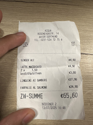 Read moreMeiner Meinung nach: keinen einzigen Stern wert. ich war gestern nach längerer Zeit wieder im ACQUA zum Abendessen und war ehrlich gesagt schockiert. Unhöflichkeit, Unprofessionalität des Kellners und starke Qualitätsabnahme der Speisen. Fazit des Abends: nach den mäßig schlechten Vorspeisen, das Abendessen abgebrochen. Trotz Nachfrage, wurde dies auch nicht korrigiert sondern, mit einer beleidigenden Ausdrucks- und Wortweise belächelt. Sehr schade und enttäuschend. Ich finde, davon sollte der Manager erfahren, da das tolle „Acqua“ wie es mal war, anscheinend nicht mehr existiert.