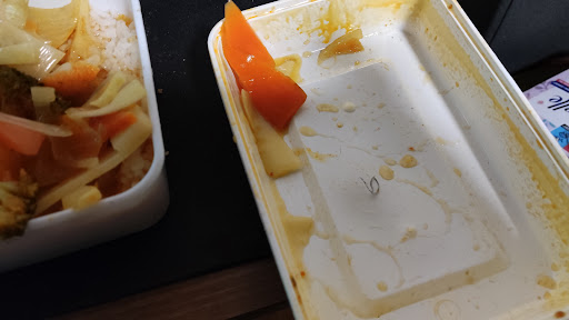 Diese entdeckte ich leider erst, nachdem ich sie in meinen Reis gekippt habe. Zuerst sah ich auch nur ein Stück, weshalb wir ein Auge zudrückten und waren bereit, Kompromisse zu machen. Nachdem ich sah, dass noch mehr der Soße und des Gemüses kontaminiert waren, ruften wir erneut an.
