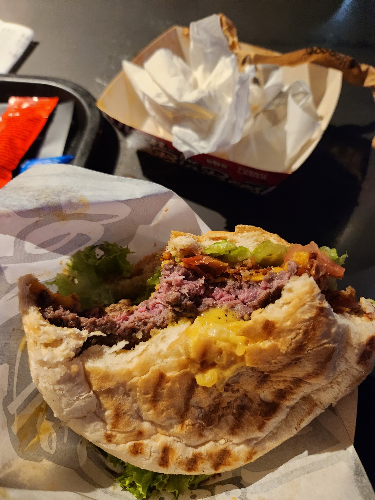 Das Ambiente war zudem auch total anders als sonnst. Gut ich muss zugeben wegen der essener Motorshow halt etwas überlaufen aber trotzdem dieses rum gebrülle im Laden und 2x anstellen müssen einmal zum bestellen und einmal abholen, das könnte man doch mit einer Anzeige Tafel besser machen wenn man doch weiß das so hoher Andrang da ist.