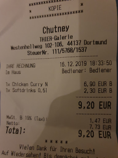 Read moreDer Chutney in Dortmund ist die erste Anlaufstelle für mich wenn es darum geht, ein leckeres und preislich sehr gutes Essen zu bekommen. Ich bin bereits öfters dort zum Essen gewesen und wurde noch nie enttäuscht. Man bekommt eine schmackhafte Mahlzeit für unter 10,00 €. Nachdem ich andere Indian Street Food's ausprobiert habe muss ich sagen, daß ich nichts vergleichbares kenne. Die Portionen sind sehr groß um satt zu werden und wenn man einen großen Hunger hat, kann man noch eine extra Portion Basmatireis für kleines Geld dazu bekommen. Sitzplätze sind ausreichend vorhanden. Die Mitarbeiter sind sehr freundlich und zuvor kommend. Der Basmatireis ist schwer zuzubereiten und ich habe es noch nicht erlebt, dass er geklebt oder nicht richtig gar war. Ich habe bisher einen lockeren und gut mit original indischen Gewürzen gewürzten leckeren Basmatireis serviert bekommen. Dadurch entstand das Vertrauen was ich Ihnen gegeben habe. Und das zu Recht. Aber auch die Soßen, ob Palak Paneer, Beef oder Chicken Curry, sind einfach nur lecker. Die Qualität ist auf einen sehr hohen Stand und man merkt daran, daß Sie ihren Job verstehen. In dem Essen sind keine Zusatzstoffe etc. enthalten. Man bekommt für sein Geld ein natürliches und gut verdauliches Essen. Ich kann jedem der in der Nähe ist nur Empfehlen, den Laden einmal aufzusuchen um sich selbst davon...