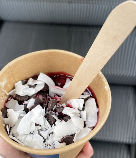 Ich habe mir den "Naschkater mit Apfel" für unterwegs geholt. Das ist ein warmer Porridge mit veganer Zartbitterschokolade, Banane, Apfel und Ahornsirup.🍫🍌🍎🌾