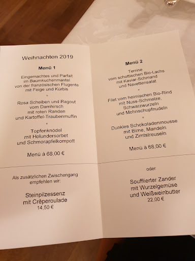 Read moreWir hatten unsere Weihnachtsfeier von der Kanzlei hier verbracht und waren sehr erstaunt dass wir die einzigen Gäste an diesem abend waren. Hatten ein vier Gang Menü im Vorfeld bestellt. Leider und dass war nicht nur mein persönlicher eindruck waren die Speisen zwar handwerklich gut gemacht, aber von einem außergewöhnlichem geschmackserlebnis sehr weit entfernt. Für den vierstelligen Betrag der uns der ganze Abend gekostet hatte, hatten wir uns einfach mehr versprochen. Leider war auch der Service zwar aufmerksam, aber sehr gezwungen freundlich, so dass wir relativ früh die Feier beendeten. Von mir leider keine...