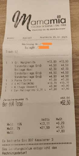 Ich habe das MamaMia gestern Abend mit 16 Arbeitskollegen besucht. Die Reservierung lief problemlos. Am Morgen erhielt ich sogar noch einen Anruf, ob sich an der Anzahl der Personen oder Uhrzeit etwas geändert hat. Ein sehr aufmerksamer Start. Schade, dass dies jedoch das einzige positive Erlebnis in Sachen „Service“ war.