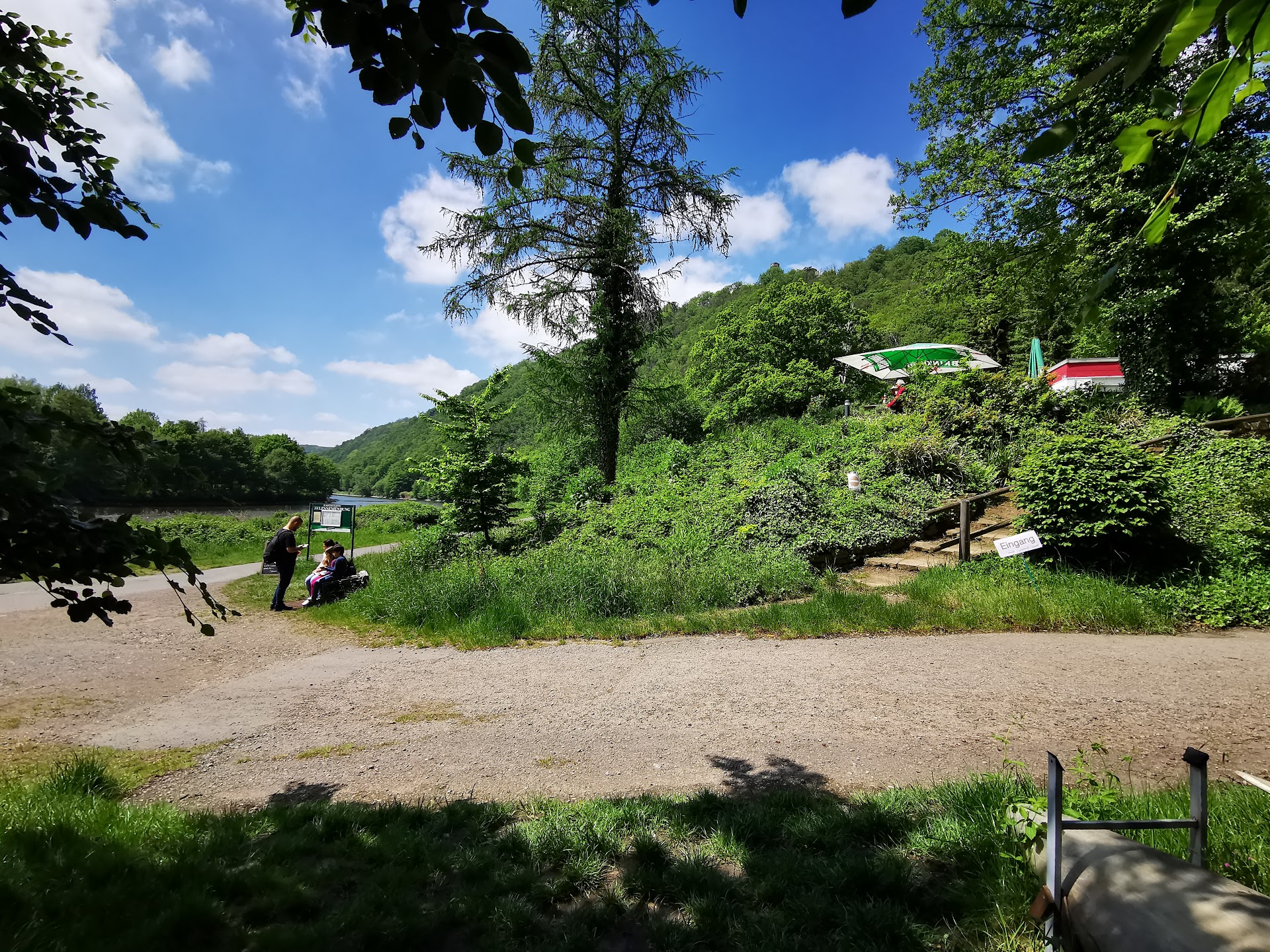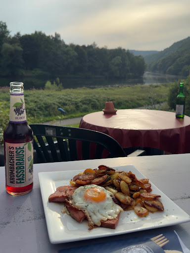 Boah, ist das Schade! Und eine Schande. Und unverständlich obendrein wie man einen Biergarten in einer dermaßen tollen Lage so präsentieren kann. Die ganze Anlage, sowie das Gebäude von außen stellte sich bei unserem Besuch als sehr ungepflegt dar. Natur - Biergarten hin oder her: Die zusammen gesammelten Tische und Stühle könnten zwischendurch mal abgeputzt werden zumal dort auch echtes Geld für Speisen auf mäßigem Frittenbuden-Niveau verlangt wird - in Selbstbedienung. Einige stellen hier die tollen gekühlte Getränke hervor: Flaschenbier ist nicht die Krönung der Gastronomie! Und ein Bier in den Kühlschrank zu stellen ist auch keine Magie sondern eine Selbstverständlichkeit. Aber ein Bier aus dem Plastikbecher - ist zumindest in einem gut geführten Biergarten ein Fauxpas! Liebe Betreiber: Leider sind nicht all eure potentiellen Besucher Ultrasportliche Radler. Der Treppenaufgang ist für Menschen mit einer Bewegungseinschränkung etwas zu sehr „Natur“. Ich hatte trotz sporadischem Geländer Mühe nicht auf die Nase zu fallen! Dieser Aufgang ist nicht Naturnah- Er ist schlichtweg im A....! Eine kleine Warnung, die aber hoffentlich nicht auf das Konto des Betreibers geht: Wer „Oben“ an der Rezeption des Campingplatzes parkt, sollte ebenfalls gut zu Fuß sein. Der ausgeschilderte Wanderweg um den Platz herum zum Biergarten ist zwar nicht übermäßig weit aber ebenfalls schwierig für Menschen mit Problemen beim gehen. Ein Hinweis darauf, sowie auf alternative Wege zum Biergarten wäre echt hilfreich! Fazit: Supertolle Lage aber leider wird nix draus gemacht- Geld verdienen mit möglichst wenig Leistung -...