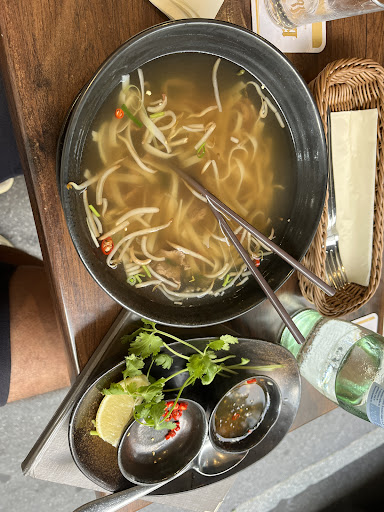Read moreDer junge Mann den wir als Bedienung hatten, war wirklich sehr nett und hätte sogar auf sein Trinkgeld verzichtet, nur damit die sich keine Umstände machen müssten. Zu Essen hatten wir Pho Bo und Gemüse Pho, dazu noch Tra Quat und Kaffee (den wir eigl. als vietn. Kaffee erwartet hätten, aber unser Fehler, dies nicht anzugeben). Das Pho Bo war nicht überragend, aber war gut, das Fleisch war jedoch ein bisschen zu zäh für mich. Das Gemüse Pho war leider enttäuschend für uns. Die Brühe ok, aber das Gemüse bestand unteranderem aus Zucchini, Champignon und noch einen weiteren deutschen Gemüsen, also sehr unauthentisch für unseren Geschmack. Erwartet hätten wir schon vietnamesisches Gemüse, Sojasprossen hätten gereicht. Kaffee war Kafee. Tra Quat habe ich bestellt, da es ein Vietnam ein Klassiker ist, hat mich an meine Origin erinnert, deswegen hab ich es bestellt. Nun hatte ich erwartet, dass es wie im Ursprungsland mit Eis serviert und geschmacklich sollte es sehr explosiv werden. Das Getränk wurde aber heiss serviert, was ansicht in Ordnung war, da Tra (=Tee) logischerweise hierzulande heiss serviert wird, mein Fehler wieder, nicht daraufhinzuweisen. Aber es schmeckte leider wirklich nicht gut für mich. Der Tee war anstatt sehr aromatisch süß zu sein, für mich leider eher wässrig und säuerlich. Das fand ich sehr enttäuschend. Anschließend waren die Toiletten eher schmutzig.