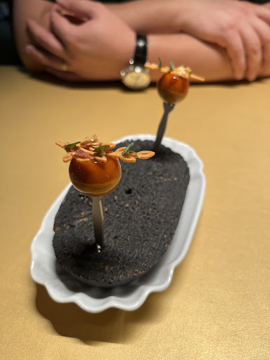 Hinter goldenen Ketten öffnet sich der Speiseraum: dunkel, sinnlich, fast filmisch. Die Tische leuchten wie goldene Inseln im Schatten, dazu Musik, die perfekt passt: Springsteen, M.C. Hammer. Kein klassisches Sternerestaurant, sondern ein Ort, an dem man sofort gern bleibt.