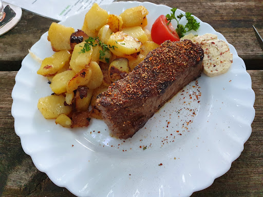 Read moreWo fange ich an.... Ein Kleinod -- Man sieht schon von aussen .. wie liebevoll dort alles angerichtet ist. Durch ein Steintor kommt man in den Innenhof des alten Bauernhofes - hoch oben mit Wein bedeckt. Überall stehen kleine oder große Tische. Alles ist liebevoll dekoriert ohne aufdringlich oder kitschig zu sein. Einfach aber authentisch. Rechts an der Seite ist der Getränke Ausschank. Rechts daneben ist eine Uralte Weinrebe die immer noch weiter wächst. Von meinem Opa weiss ich etwas über wein und die Reben und diese muss über 100 Jahre sein. Weiter --- man geht nun in einen alte Viehstall der heute der Gastraum ist .... Toll ... recht noch ein weiterer kleiner traumhaft dekorierter Raum. Die Tische alle alt und liebevoll eingedeckt- Das Ambiente ... Traumhaft, ein altes Telefon an der Wand .. ein paar Sprüche an der Wand ... alles in diesem alten Sandsteinambiete. Und nun .. das Essen ... zu der sehr leckeren Karte kommen noch de Tagesgerichte. Heute Tomatensuppe .. Steak mit Bratkartoffel (meins - obwohl ich die Bratwürste wollte) und noch einiges mehr... Wir wählen kunterbunt und dann kommt es - das Essen .... Bei Bratkartoffeln bin ich echt pinzig ... und was soll ich sagen - die sind Megalecker ... Super krustig nicht verbrannt ,.. nicht in Fett ertränkt ... nicht matschig. Hammer. Mein Sohn hatte ein Kochkässchnitzel ...super lecker ..alles war Mega und mehr als reichlich! und dann gab es noch einen Nachtisch ... Zitronencreme mit Erdbeeren .... fertisch ... Ich habe fertig... Heidi ihr Mann und ihre Tochter....