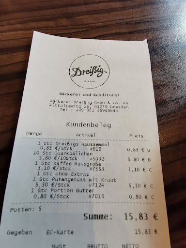 Ich habe die Bäckerei Dreißig besucht und war vom Gesamtbild leider sehr enttäuscht. Mein Eiskaffe schmeckte als stände er schon Tage da, als wäre das nicht schlimm genug fehlte das Eis. Den Kaffe habe ich stöhnend hintergeschluckt aus Angst vor einem Kommentar der Kassiererin – doch der Service hat den Aufenthalt komplett negativ geprägt.