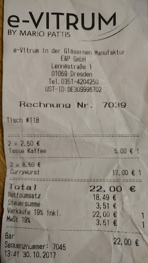 Ich holte mein Frau vom Tisch ab, damit wir noch rechtzeitig zum Konzert in der Gläsernen Manufaktur (um die Ecke) kommen. Auf das im Neueren bezahlte Dessert mussten wir aus Zeitgründen verzichten.