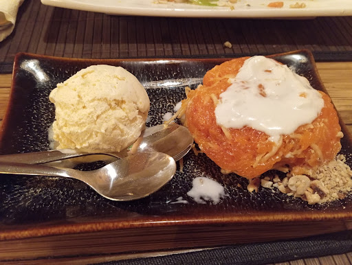 Ich betrete ein angenehm ausgestattetes Restaurant. Es ist im üblichen asiatischen Stil eingerichtet. Ich werde recht schnell und freundlich bedient. Ich bestelle zunächst einmal eine Sommerrolle mit Hühnerfleisch. Recht schnell kommen zwei große Sommerrollen. Zu meinem Erstaunen gibt es eine Erdnuss Sauce dazu anstatt der üblichen süßlichen Soße. Damit hätte ich nicht gerechnet und so hätte ich die Sommerrollen auch nicht bestellt. Auf der Karte gab es kein aller Hinweis auf die Erdnusssoße. Der verbindliche Hinweis auf das entsprechende Allergen fehlte ebenfalls. Ich war schon so etwas enttäuscht.