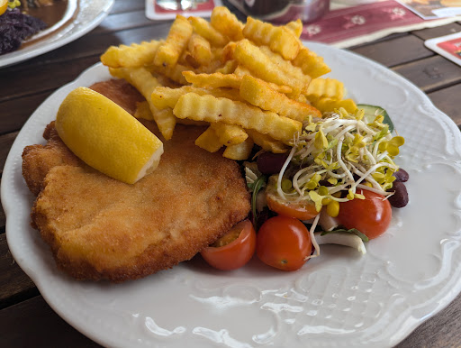 Oof. I was hoping for more out of this spot! We saw photos of the interior and got excited for a cozy vibe but when we got there, it was like a funeral home inside. Instead, we opted to sit outside, which is near the river but tucked away a little right across from a souvenir shop, so the vibe is nice but a little closed off. The service is very friendly and helpful and helped us decide what to order. Unfortunately the food didn't make up for the letdown of the atmosphere. The schnitzel was a little thick (though well flavored and the fries were great) and the rolled cabbage was missing something. It kind of makes sense because the place started as an antique shop serving coffee as a courtesy, slowly expanding their menu to appease shoppers, and finally just turning into a full-blown cafe/restaurant. But for a hearty German meal, there are better spots...