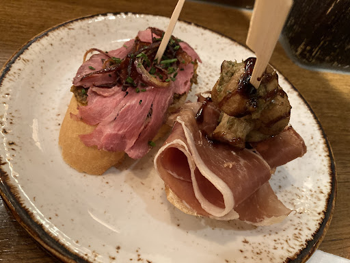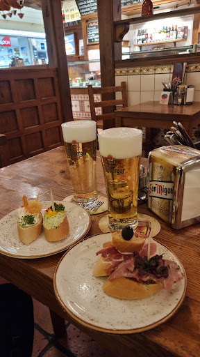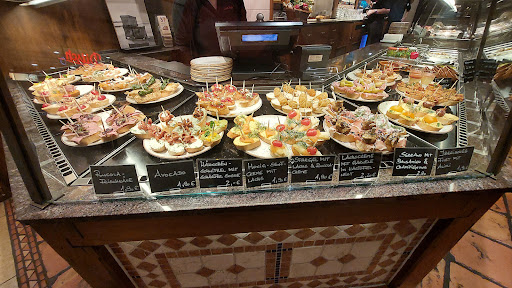 Read moreIch gehe hier gerne hin, weil man etwas Urlaubsflair bekommt. Besonders der spanische Kaffee ist ein Gedicht und für ein paar Häppchen, wenn man gerade nicht den riesen Hunger hat, ist es immer super. Ein Stern Abzug, weil das Personal oft sehr hektisch wirkt und sich sowas auf den Gast überträgt. Es ist ja keine Notaufnahme und ich warte lieber ein paar Minuten länger, als dass ich eine Atmosphäre wie auf dem Bahnhof habe und nicht runterkommen kann. Ich kenne aber auch Unternehmen, wo es ungeschriebenes Gesetz ist, immer hektisch und geschäftig aussehen zu müssen oder so zu tun-ich finde sowas furchtbar. Ich fände Trennwände zur Theke gut, damit man die Hektik nicht so mitbekommt. Es sind dort auch kaum mal Schlangen und ich frage mich immer, warum man in so eine Hektik verfallen muss. Ein anderer Minuspunkt ist die furchtbare Musik. Wirklich immer. Da könnte man so schöne spanische Musik spielen, die einen in Gedanken in den Urlaub beamt, aber nein: irgendwas zwischen Prollo-Disko und 13-jähriger mit musikalischer Geschmacksverirrung weiß dies...