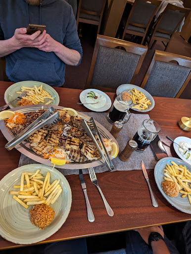 Read moreGuter Grieche. Das Lokal ist einfach zu erreichen, ca. 5 Gehninuten vom Wasaplatz entfernt. Parkplätze sind in der Nähe, wenn man bisschen sucht findet man was. Das Lokal betritt man über die Terasse, leider ist das nicht sehr behindertengerecht. Eine Rampe ins Lokal ist vorhanden (kann angebracht werden), doch mit Rollator oder Rollstuhl alleine (ohne Begleitung) hinzugehen wird sehr schwierig. Das Ambiente ist sehr angenehm da hier nur dezent dekoriert wurde und es nicht so überladen wirkt wie bei anderen griechischen Lokalen. Zum Empfang gibt es einen Ouzo aufs Haus. 👍 Beim Essen schwanke ich zwischen 3 und 5 Sternen. Es ist gut aber nicht außergewöhnlich. Wir waren mittags hier. Die Karte ist auf jeden Fall ausreichend und für jeden was dabei. Die Mittagskarte ist günstig aber mit kleineren Portionen! Was gerade für ältere oder den kleinen Hunger völlig ausreichend ist. Wir hatten verschiedene gemischte Platten. Die Portionen von der normalen Karte waren reichlich, nur war alles sehr lieblos angerichtet. Mit Beilagen wird hier sehr sparsam umgegangen und eine Dekoration am Teller gibt es nicht. Leider was das Gyros kalt, die Leber etwas hart und durchwachsen. Schwein und Lamm waren geschmacklich sehr gut. Das Zaziki ist sehr lecker. Die Pommes waren etwas lapprig, ich mags lieber knusprig. Das Salatdressing war sehr gut. Von einer gemichten Grillplatte für 18 Euro wird man durchaus satt. Der Kaffee danach war sehr, sehr stark, eher nicht mein Ding. Der Service war gut und alle Bedinungen sehr freundlich. Die Sanitären Anlagen im Gewölbekeller waren mal was anderes. Es gab sogar einen Wickeltisch. Alles war sauber und gepflegt. Zur Rechnung gabs noch ein Gläschen Schnaps mit einer Kirsche drin. Uns hat das...