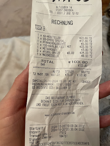 Read moreDas Griechische Restaurant Olympos befindet sich in Dresden Leuben genau gegenüber der Staatsoperette. Das Restaurant Ambiente ist typisch griechisch. Wir hatten einen Tisch reserviert, was bei der Auslastung auch nötig war. Das Personal ist freundlich und wir wurden schnell an unseren Tisch geführt. Leider werden absolut keine Abstandsbemühungen unternommen. An unserem Tisch saßen keine 40cm die nächsten Gäste. Ich kann verstehen das die Geschäfte nach der langen Schließung versuchen ihre Umsatzeinbußen zu kompensieren. Aber den Laden so voll zu machen finde ich nicht in Ordnung. Die Speisekarten wurden schnell an den Tisch gebracht, leider klebte meine ziemlich und war auch offensichtlich auf der Front verschmutz. Die Karten sind abwischbar, dies sollte eigentlich nach jedem Kunden gemacht werden. Die Getränke wurden schnell aufgenommen und wurden schnell gebracht. Leider wurde da die Essenbestellung noch nicht mit aufgenommen. Nach einiger Zeit kam ein anderer Kellner und nam die Bestellung auf. Vorspeise ( Tzaziki) wurde auf Nachfrage Dann mit den Salaten der Hauptspeisen nach 45min gebracht. Die Hauptspeisen kamen nach insgesamt 80min an den Tisch. Viel zu lange!! 19 Uhr Tisch bestellt und 20.40Uhr das Essen. Die Hauptspeisen waren reichlich, Grillpatte (81) - leider Tomatenreis versalzen und das Gyros (was an Stelle der Leber, die aus war ) mit drauf war war leider stellenweise verbrannt und bitter. Bifteki (57) - Tomatenreis versalzen, Bifteki lecker Lammkotlett (62) -Lecker Als Wiedergutmachung wurde dann die bestellte Nachspeise vergrößert und für alle bereitgestellt. Was auch nicht in Ordnung war ist die Tisch Hygiene, als die Gäste neben uns gingen wurde die Tischdecke entfernt der Tisch abgewischt (roter Lappen) und die selbe Tischdecke wieder drauf gemacht. Dieser rote Lappen wurde in dem Fall nicht ausgewaschen sondern gleich vom nächsten Kellner genommen und zum nächsten Tisch getragen. Unsere Tischdecke hatte Speisereste von anderen Gästen. Resümee: Wenn der Laden nicht nicht so voll wäre, würde sicher mit mehr Sorgfalt und Liebe gearbeitet werden. Es wird sich Mühe gegeben.