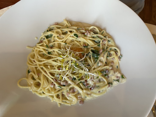ESSEN und TRINKEN Als kleinen Gruß aus der Küche gab es zum Anfang ein selbst gebackenes und frisches Oregano-Brot mit Aioli. Beide Komponenten waren einfach mega lecker und die Knoblauchnote war der Hammer. Wir haben zu dritt 2 Pasta-Gerichte und 1 Pizza bestellt. Die Pizza Antipasti für 14,50€ war reichlich mit frischen eingelegten und marinierten Gemüse belegt. In Summe war es eine gute Pizza, mit einem sehr dünnen Boden und knusprigen Rand. Leider ist der Teig doch ein wenig weit weg von original napoleonischen Pizza. Aber der Beleg gleicht dies sehr gut aus. Zudem könnte die Tomatensauce ein wenig aromatischer sein und weniger Zucker beinhalten. Wir hatten noch 2 Pasta-Gerichte, welche jeweils mit Spagetti Gericht wurden. Die Carbonara für 14,90 € und die Gambaretti mit Spinat für 16,90 €. Die Carbonara mit Speck und einem ganzen Egelbi war gut und hatte eine sehr gute Kräuternote. Das Ei konnte man dann direkt beim Beginn selbst unterrühren. Die Spagetti mit Gambaretti und Spinat für 16,90€, mit einer Sahnesauce waren auch gut. Hervorzuheben waren hierbei besonders die Gambaretti, welche sehr gut gegart und absolut saftig und nicht trocken waren. Leider waren beide Pasta-Gerichte mit Hartweizen-Pasta, welche zwar einen guten Biss, aber wenig Intensität und Eigengeschmack hatten. Als Getränke haben wir eine Flasche Wasser für 6,90 € und einen FRATI Weißwein für 8,90 für 0,2 L bestellt. Der Wein war sehr köstlich und eine perfekte Begleitung zur Pizza und Pasta. Eine klare und deutliche Empfehlung!