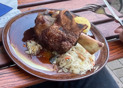 Als dann der Hauptgang serviert wurde, verging uns allerdings die Freude. Wir hatten ein Cordon bleu und eine Haxe bestellt. Das Cordon bleu war leider sehr trocken, und die Fettschicht der Haxe war so hart, dass ein Backstein weicher gewesen wäre. Als ich nachfragte, ob es normal sei, dass das Fett so hart ist, nahm unsere Bedienung den Teller mit in die Küche, kam etwa eine Minute später zurück und meinte: „Die Küche sagt, das ist normal. Wenn es zu hart ist, lassen Sie es einfach auf dem Teller, wenn Sie es nicht essen möchten.“ Es war auch sehr offensichtlich das die Kruste verbrannt war und es abgekratzt wurde .