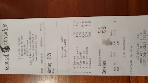 Wenn auch die Preise für das Sushi sehr fair sind, muss man die Preise für die Getränke bemängeln. Diese sind doch sehr hoch. 4 japanische Bier, 2 Schorle und ein kleines KiBa für 30€ ist dick aufgetragen.
