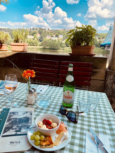 Read moreDurch die leicht abseits liegende, schöne Lage ist das Restaurant nicht von Touristen überlaufen. Uns wurde die Villa Marie für unseren Kurztrip nach Dresden zwingend empfohlen. Insgesamt waren wir aber sehr enttäuscht. Wir hatten extra reserviert, letztlich bekamen wir einen Platz auf dem Kiesweg im Vorgarten des Restaurants, bei dem man sich richtig schön im Weg fühlt und auch nicht viel der eigentlich schönen Lage mitbekommt. Mein Vorspeisensalat war ölig und versalzen - etwas anderes als eine Entschuldigung von der daran wahrscheinlich komplett unschuldigen Aushilfe bekam ich dafür jedoch nicht. Der Hauptgang war dafür sehr lecker und das Dessert gut. Schade fanden wir auch, dass der/die für uns zuständige Kellner an dem Abend ein paar mal wechselte und die Dame die den Wein gebracht hat uns zu diesem auch nicht ein paar Zeilen erzählen konnte. Später konnte man ihr sichtlich anmerken, dass sie schlecht gelaunt war. Selber in der Gastro tätig kann ich den vermuteten Stress durchaus verstehen - anmerken sollte man ihm dem Servicepersonal trotzdem nicht die ganze Zeit. Wir sind sicherlich keine außergewöhnlich kritischen Menschen und haben uns bis auf den Kommentar zum Salat auch nicht anmerken lassen, was uns störte, allerdings ist es alles eine Frage des Niveaus. Wer gehobenere Preise für Essen und Trinken fordert, sollte auch eine entsprechende Qualität an Dienstleistung...