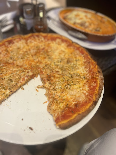 Auch die Menge war sehr gut für den Preis. (1. Bild Hintergrund). Die Krabbenpizza war ebenfalls sehr gut, der Pizzateig schön kross und dünn. (1. Bild Vordergrund)