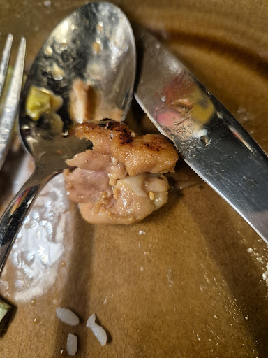 Irrgendwann wurde die erste Bestellung für Vorspeisen aufgenommen. Hier schon Auffällig das mit allen Oel und zu hoher Hitze fririert wurde. Z b das Kimchi Pfannkuchen war äußerlich Schwarz. Nach 2Stunden kam unsere Hauptspeisen. Wobei eines vergessen wurde Hier war der Reis absolut falsch zubereitet. Resümee, der Sohn meines Freundes musste sich draußen mehrfach übergeben bei einer Ansprache mit dem Chef gab es nur ein Schulter zucken, kein Einlenken ubd ich warf 170Euro zum Fenster raus