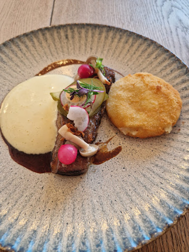 Read moreDie Faktorei ist am Duisburger Innenhafen gelegen, auf den man vom Restaurant aus einen schönen Blick hat. Die Inneneinrichtung ist im positiven Sinne gediegen - solide, gemütlich, mit viel Holz und Bildern an den Wänden, unaufdringlich. Wir haben uns sehr wohlgefühlt. Dazu trägt in hohem Maße auch die charmante Bedienung in der Faktorei bei, die uns sehr freundlich und kompetent beraten hat und auf alle unsere Fragen zu den einzelnen Gängen eine Antwort hatte. Wie gesagt waren wir wegen der Gourmet-Küche zum kleinen Preis da und haben dementsprechend das 5-Gänge-Degustationsmenu zum Preis von 85€ je Person genommen (so viel zum „kleinen Preis“ aus der Instagramm-Werbung von Radio Duisburg). Die Minimumanzahl für das Degustationsmenu sind drei Gänge für 55€ pro Person. Um es vorwegzunehmen: Wir wurden nicht enttäuscht und das Essen ist den Preis auf jeden Fall wert. Das Dinkelbrot mit der „verbrannten Butter“ im ersten Gang „Brot und Spiele“ war köstlich und wir waren deswegen schon am Überlegen, den Gang zu wiederholen, was wir uns dann aber wegen der insgesamt 5 Gänge dann doch verkniffen haben. Gang 2 („Ackergold“) und 3 („Miso-Power“) waren geschmacklich abwechslungsreich und ebenso überzeugend. Unbedingt probieren! Einen kleinen Einbruch gab es aus unserer Sicht bei Gang Nr. 4, dem Umami-Streich, der aus einem Stück Rindfleisch, heller Gurken-Kimchi, geräucherter Hollandaise und einer Art Kartoffelkrokette in Umami-Sud bestand. Das Fleisch und die „Kartoffelkrokette“ schmeckten im Vergleich zu den anderen geschmacklich deutlich raffinierteren Gängen weniger inspirierend und erinnerte mehr an „gutbürgerliche„ Küche. Das ausgezeichnete Dessert („Warm und flüssig“) hat das anschließend aber wieder mehr als ausgeglichen. Unser Fazit der Faktorei im allgemeinen und des Degustationsmenus im Besonderen: Unbedingt ausprobieren. Wir werden sicher wiederkommen und freuen uns schon auf die nächste Speisekarte. Kompliment noch einmal an die Küche und die Bedienung für diesen sehr...