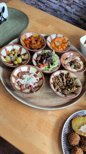Auf der Speisekarte steht das der Teller mit Falafel, Hummus, Zaytun, Foul, Baba Ghanoush, Karottencreme und einem Salat serviert wird. Leider ist uns dies erst beim Schreiben der Rezension aufgefallen und wir finden es nicht in Ordnung, das man nicht das bekommt, was man bestellt! Das Foul und die Karottencreme schmeckten nicht gut und frisch und beim Blick in die Kühltheke haben wir uns schon gedacht wieso.
