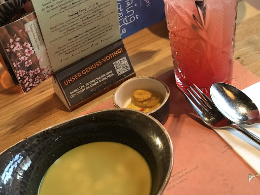 Das Essen wurde schnell mit einer fertigen Tagessuppe begonnen. Currysuppe mit Kochbananen. Der Koch in dem Falle schien wohl verliebt zu sein.