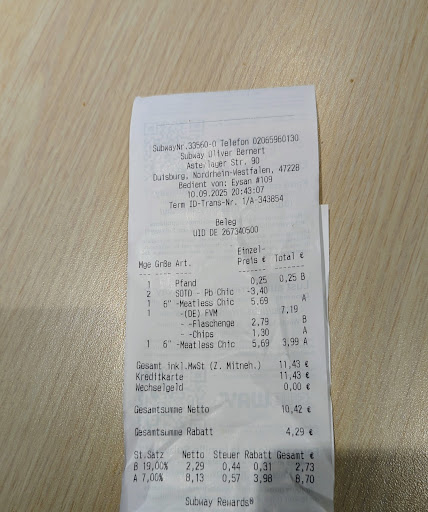 Read moreEigentlich gehe ich seit Jahren zu euch und bin auch immer zufrieden. In letzter Zeit leider gar nicht mehr. Vor einigen Wochen wollte ich mir zwei 15er Subs mit einem 2 für 1 Gutschein holen. Die zwei Mitarbeiter bekamen es einfach nicht hin, den Gutschein einzugeben, sodass ich am Ende für einen 30cm Veggie Delite 4€ statt 3€ zahlen musste, weil es das System angeblich anders nicht angenommen hat. Vor einigen Tagen wollte ich zwei dieser Gutscheine für mich und meinen Freund anwenden (welcher im Auto gewartet hat) An der Tür stand schon, dass Kartenzahlung momentan nicht möglich ist. Ich habe also 2 Mal 30cm Subs bestellt mit zwei Gutscheinen in der Hand. Erst als ich zahlen wollte, sagte man mir plötzlich, dass zwei Gutscheine pro Person nicht gingen, obwohl es bisher immer ging. Ich hätte mir gewünscht, dass man mir dies früher gesagt hätte, da es bisher immer funktionierte und ich auch nur gerade so genug Bargeld dabei hatte. Die Subs sind lecker, aber das Verhalten der Mitarbeiter geht...