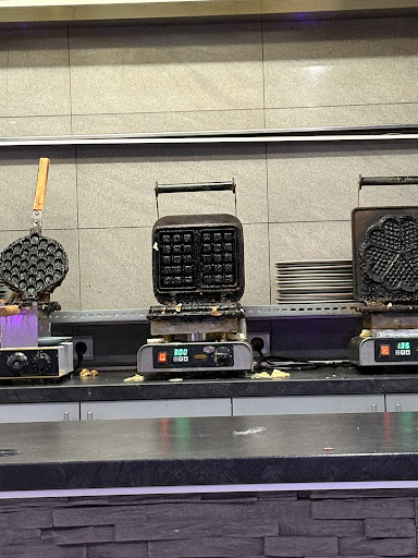Beim Betreten wurden wir von den beiden Mitarbeitern nicht begrüßt. Erst auf Nachfrage wurde unsere Bestellung aufgenommen. Wir setzten uns in Sichtweite der Küche – dort sahen wir die stark verschmutzten Waffeleisen. Es wirkte, als wären sie seit der Eröffnung nie gründlich gereinigt worden.