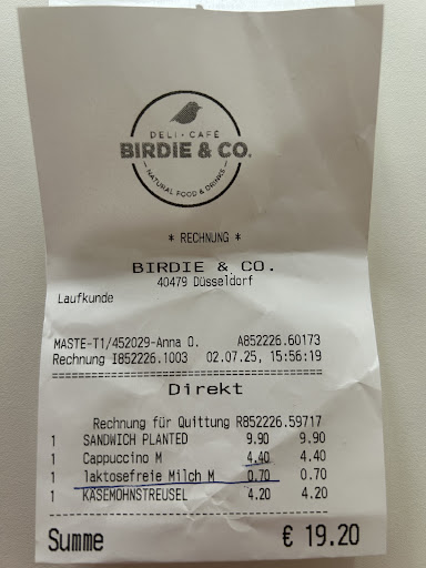 Found this place while searching for a Café or Restaurant in Düsseldorf that offers delivery service. I have placed an order from Mexico for the brother of my friend and roomie, who lives and works in Germany (like I do in Mexico now). We wanted to surprise him with breakfast and the team from Birdie & Co. was extremely kind and helpful, even though the situation is kind of rare (someone ordering breakfast from Mexico for someone who lives in Germany - sounds pretty weird, right?) But we were greatly supported and the delivery arrived as discussed with the team! Paying was very easy because it can be done via PayPal. Also the food got great feedback from the recipient. ☺️ Super pleased with the customer service! I am from Stuttgart originally, but will definitely drop by when I am visiting friends and family in...