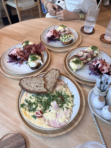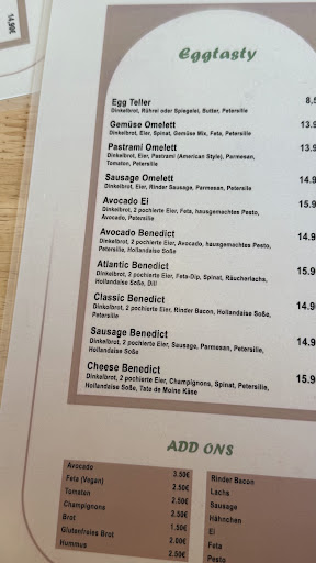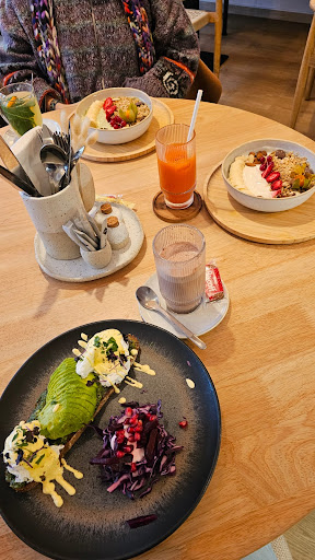 Read moreEin Instagram-Café, bei dem Optik vor Qualität und Geschmack kommt: Wir waren heute zu dritt zum Frühstück da. Die Einrichtung und Atmosphäre ist ganz nett und wirkt zum Großteil mit einem Auge fürs Detail zusammengestellt. Die Karte kommt als laminiertes A3 Blatt. Das Angebot umfasst verschiedene, auch ausgefallene Warmgetränke, Säfte und Smoothie/Shakes (auf Nachfrage können diese auch mit pflanzlicher Milch zu bereitet werden, 1€ Aufpreis!), diese werden mit Tetrapak-Saft und nicht mit frischen Früchten zubereitet. Es gibt eine Vielzahl an Ei-Gerichten, verschiedene Bowls und süße Optionen wie Pancakes. Wir haben uns für das Eggs Benedikts Avocado Toast sowie zwei Joghurt Bowls entschieden. Auf den ersten Blick wirkt das Essen ansprechend angerichtet. Das Toast bestand aus einer relativ dünnen Scheibe Brot, nett war der Rotkohl Salat mit Granatapfel-Kerne dabei. Die Kokos-Joghurt und die Matcha-Joghurt Bowl waren sehr enttäuschend. Für 15€ bekommt man eine Schale mit Joghurt, augenscheinlich industriellen Knuspermüsli (könnte von Ja sein), geschnittener Banane, und ein paar Johannisbeeren sowie einer Physalis-Frucht dekoriert. Dazu lieblos drauf geworfen 8 Nüsse und vier Scheiben getrocknete Erdbeeren und drei Schoko Drops (ob diese vegan sind wage ich zu bezweifeln). Bei einer Joghurt Bowl für 15€ würde man frisches Obst (das auch geschmacklich und nicht nur optisch zum Essen beiträgt erwarten). Absolut schlechtes Preis-Leistungsverhältnis und bodenlos überteuert. Das Konzept wirkt nicht konsequent durchgezogen und durchdacht, zu den Heißgetränken gibt es in Plastik verpackte Kekse und Zucker und Honig sind ebenfalls in kleinen Einzelverpackungen die auf dem Tisch stehen und nicht so Recht zu den individuell und handgemacht wirkenden Keramikbehältern für Besteck und Servietten passen. Das Personal hingegen ist freundlich und der Service zügig. Es stand relativ viel Personal "herum" (5 Menschen, davon 3 in der Bedienung), aber zu anderen Zeiten sind vielleicht auch alle gut beschäftigt. Für einen erneuten Besuch reicht es...
