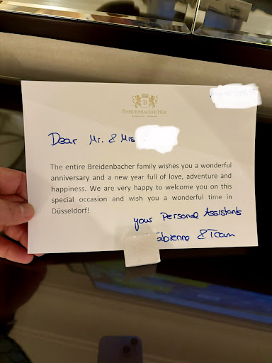 I spend 6 month per year in 5* Hotels mainly in the Mariott (Starwood) and Hilton Groups, especially in Asia, and I had the chance to compare Breidenbacher Hof to another 5* Hotel in Dusseldorf which (supposedly) used to be the best Hotel in town and where I stayed for 5 days…. WHAT A DIFFERENCE! Staff: 6(!) out of 5 Rooms 5/5 Location 5/5 Food 4/5 The staff in Breidenbacher Hof is just amazing. Highest professionalism meets and airy and joyful atmosphere. It’s the little things like everybody addresses you by your name, staff hands your credit card or documents to you using both hands, and always take their time to have a little chat with you. The hosts are generous, offering you a free drink if you look worn out when you come back to the hotel after a long work day. Sabrina is a gem, welcoming you to your breakfast, and her cheerful personality is just contagious.You can' leave without being in a good mood. Yes, 45 Euro is a steep price for a breakfast, but it is a nice variety and the quality is excellent, e.g. in October you find fresh strawberries in your home made fruit salad and you can start your day with a nice Prosecco. Things are so delicious that you don’t need any food for the rest of the day. I felt very much at home, very well taken care of and very safe (when you are a guest, you will realize why) The gym is a bit small, but still you can work your major muscles with weights, three cable machines and two leg machines, and weights are there up to 20Kg (I think). For Cardio you got a X-Trainer, two treadmills and a spinning bike… no excuse to skip workout ;) The rooms are spacious and very quiet. However, the TV is next to the connecting door between rooms, so if you want to be 100% sure that even a noisy neighbor doesn’t disturb you – get a room without connecting door. The rooms are well maintained, and (!) they have a lot of storage room – closets, side boards, cabinets, plenty of coat hangers per default… a luxury which is harder and harder to find. (I could stow away the all business and casual stuff I brought for three weeks). Beds are perfect, sometimes my back starts hurting after two weeks in a hotel, but here – nothing. Location… perfect. You basically leave the hotel and stand on the main shopping street Koenigsallee with all the more or less exclusive brands, a department store across the hotel and a mall within a 5 minute walk. The other 5 minute walk brings you also to the vibrant old town with loads of restaurants from “budget” to “not budget at all”, and the subway is across the main entrance. A big thank you to the Breidenbacher Hof team , especially to Sabarina and Mrs. Zimmermann for the warm hospitality and such a...