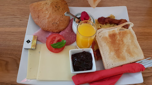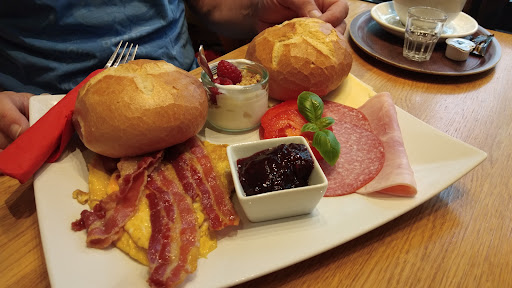 Simple breakfast eatery outside Düsseldorf train station offering pastries, savory items & coffee.