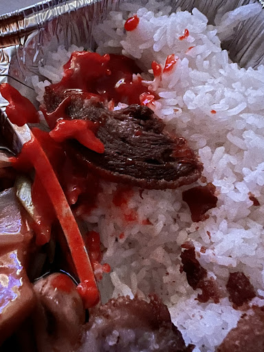 Das knusprige Fleisch war eher gummiartig und einfach geschmacklos der Reis war angebrannt