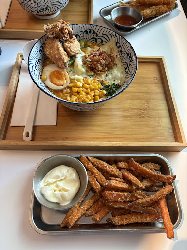 Das Essen kam nach insgesamt fast 1,5 Stunden Wartezeit. Der Koch entschuldigte sich persönlich, was wir sehr positiv fanden. Geschmacklich war das Fried Chicken sehr gut, auch Brühe und Gemüse der Ramen waren lecker. Allerdings waren die Schüsseln mit viel zu vielen Nudeln überfüllt – geschmacklich eher fade und kaum essbar. Wir hätten uns stattdessen mehr Gemüse gewünscht. Das Sushi war in Ordnung, aber nicht überzeugend – für den Preis gibt es in Düsseldorf bessere Alternativen.