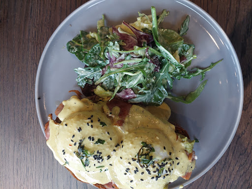 We had a reservation and were seated without issue despite the holiday crowd. We ordered the Eggs Benedict and the English Breakfast. The presentation was appealing, but the taste didn't quite hit the mark. The English Breakfast, advertised with turkey bacon on the menu, lacked the authenticity I expected from a meal inspired by London. The absence of traditional pork elements, although replaced by turkey as stated, still felt incongruent with the thematic promise. Also, the whole wheat bread served was too soft and would have benefited from toasting to add some texture.