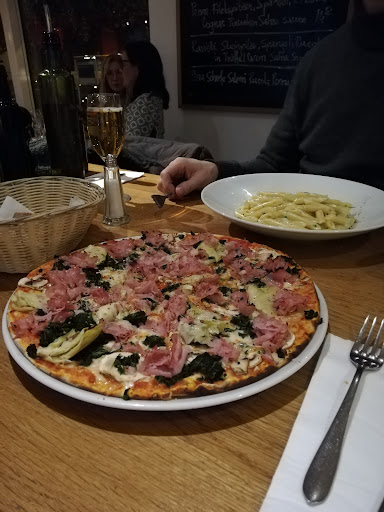 Dann kommt die Pizza, und ohne dass ich überhaupt die Möglichkeit gehabt hätte, ein Stück Brot zu probieren, wird der Brotkorb mitgenommen, ohne zu fragen, ob wir noch Brot noch möchten.